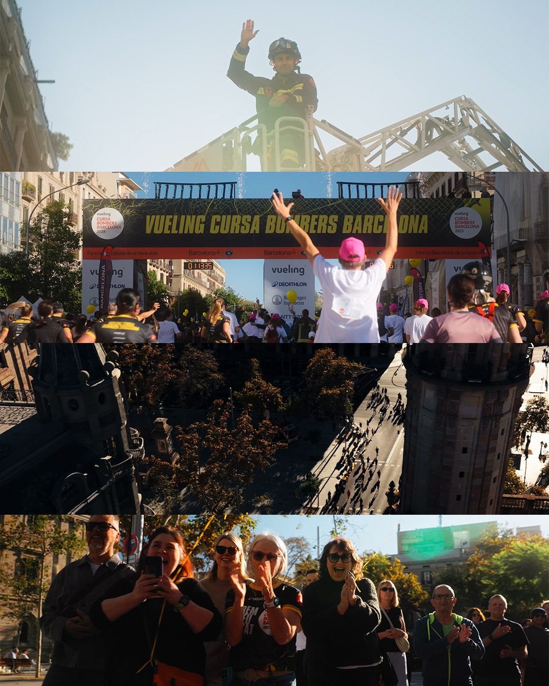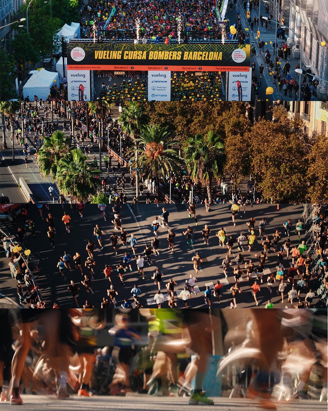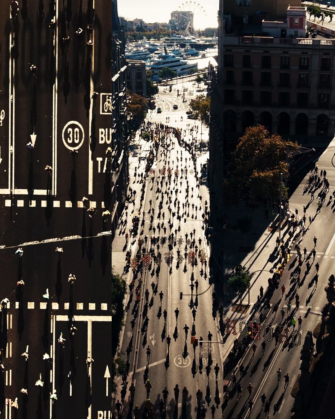 • Perspectiva Aérea (Drone): Gracias a nuestro piloto @by.alexvp, elevamos la vista para contextualizar la carrera dentro de la arquitectura de Barcelona. Los planos aéreos permitieron apreciar la “marea humana” y la escala real del evento.